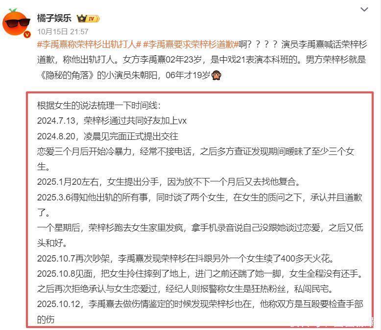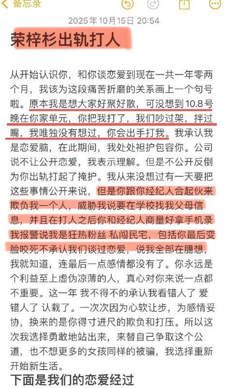19岁男演员荣梓杉在和她交往期间脚条船,还冷暴力,并殴打和污蔑她。