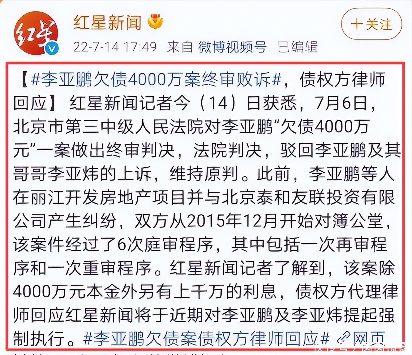 7月份,李亚鹏欠万的案子败诉,他和哥哥李亚炜被强制执行,且都限制了高消费。
